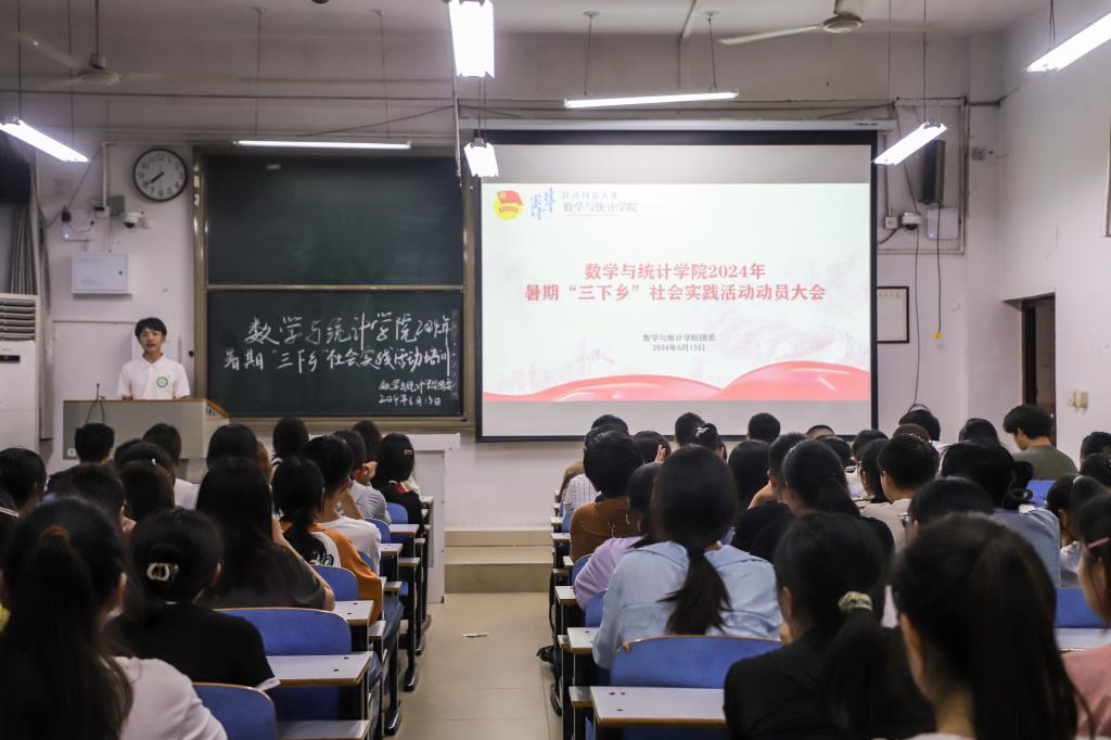 为深入学习贯彻习近平新时代中国特色社会主义思想,进一步号召动员太阳集团城娱8722学子积极踊跃投身2024年暑期“三下乡”社会实践活动,在暑期社会实践活动中受教育、长才干、作贡献,6月13日晚,我院于数学楼104教室召开2024年暑期“三下乡”社会实践活动动员大会。此次会议由2022级学生代表李璞主持,我院部分学生代表参会。