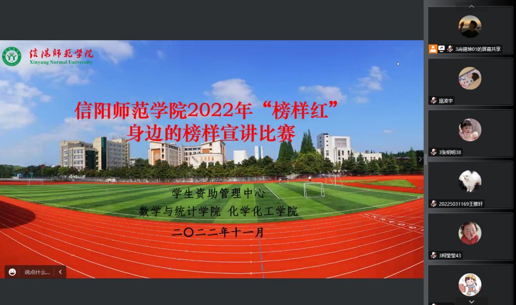 为进一步贯彻落实资助育人工作要求,全面落实国家资助政策,发挥榜样示范引领作用,学习榜样事迹、发挥榜样力量、争当榜样的浓厚氛围,进一步加大学生资助宣传力度,扩大宣传效果,2022年身边的榜样宣讲活动于11月30日以线上腾讯会议形式开展,我院资助专员杨帆老师、化学化工学院资助专员赵方方老师以及两院两百余名学生参加此次会议。