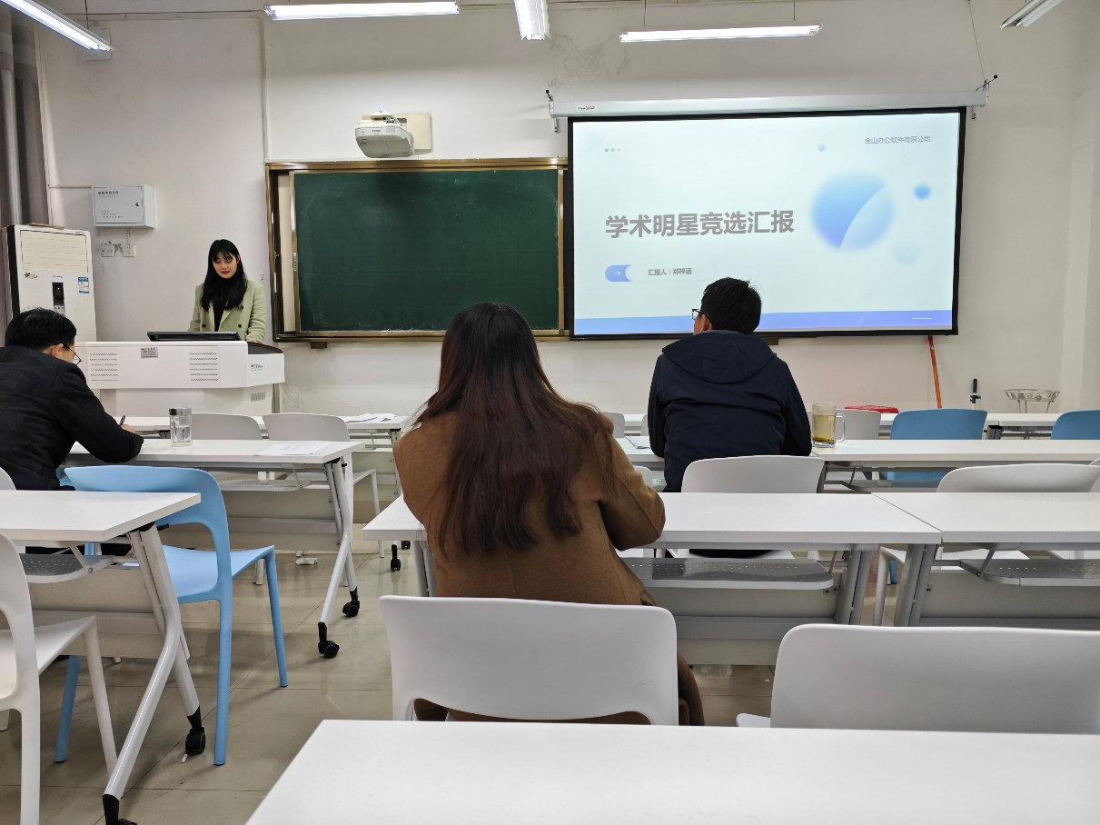 学术明星展风采。11月26日,我院在数学楼501举办“学术明星”评选,来自学院的10名学生参加竞选,曾凡奇、孙兰银两位老师担任评委。参评选手主要围绕学术成果、社会实践、获奖情况等方面进行展示,充分体现出我院研究生求是扎实的科研能力和积极向上的学习状态。最终郑紫涵和常慧婷两名同学被推荐到学校参加比赛。