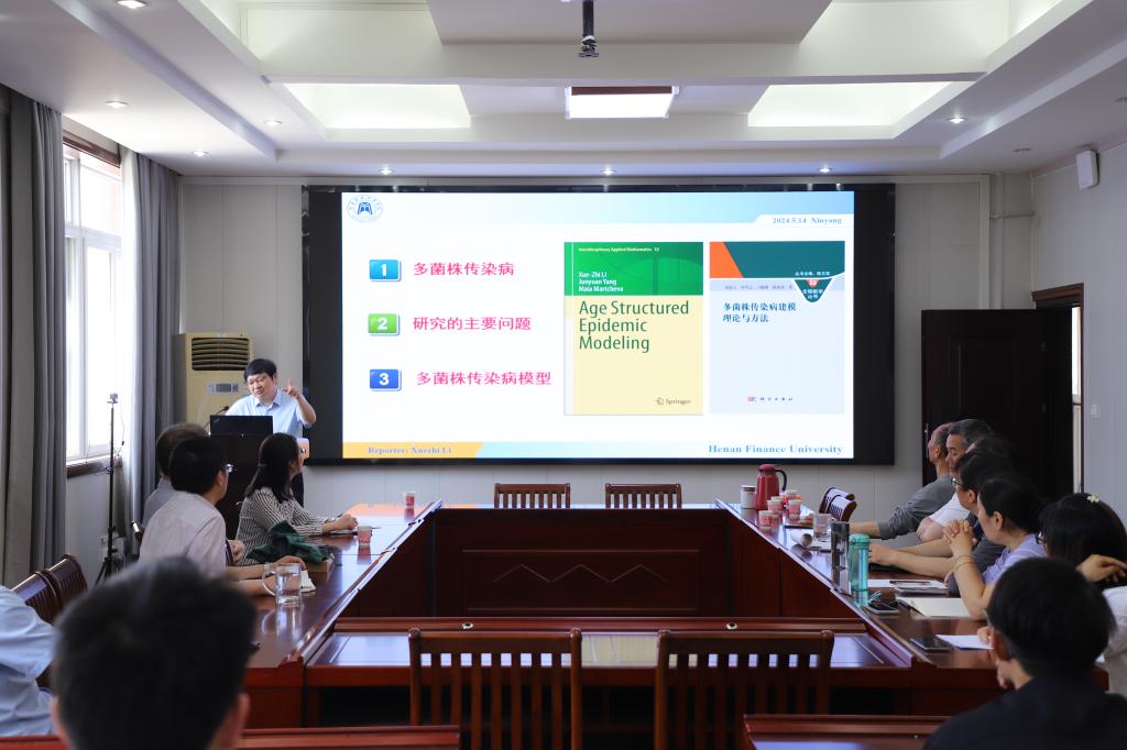 5月14日上午,应太阳集团城娱8722邀请,河南财政金融学院李学志教授在数学楼315会议室为我校师生做了题为“多菌株传染病动力学建模与研究”的学术报告,报告会由太阳集团城娱8722王霞教授主持,院长蔡礼明教授、副院长韩英波教授及部分教师和研究生聆听了报告。