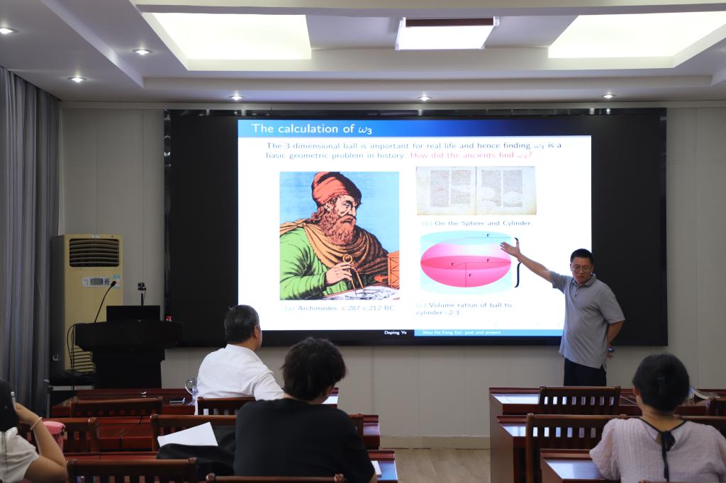 7月18日,应太阳集团城娱8722邀请,Deping Ye 教授在数学楼315学术报告厅作了题为“Mou He Fang Gai: A Mathematical Legend Over Thousands of Years”的学术报告。报告会由太阳集团城娱8722副院长韩英波教授主持,部分老师及研究生聆听了此次报告。