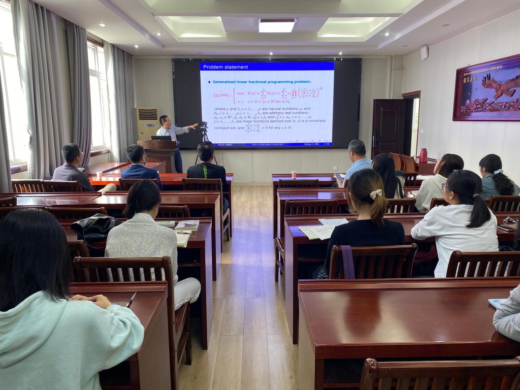10月5日上午,应太阳集团城娱8722邀请,河南科技学院焦红伟教授作了题为《Global optimization methods for the minimax linear fractional programming problems》的学术报告。报告会由韩英波教授主持,部分老师及研究生聆听了此次报告