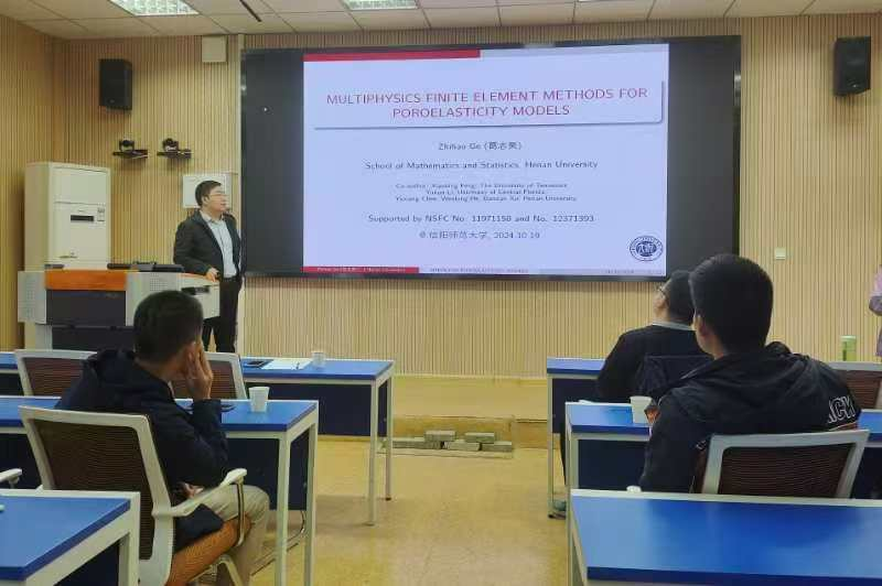 10月19日上午,应太阳集团城娱8722邀请,河南大学葛志昊教授作了题为《MULTIPHYSICS FINITE ELEMENT METHODS FOR POROELASTICITY MODELS》的学术报告。报告会由李世顺教授主持,部分老师及研究生聆听了此次报告。