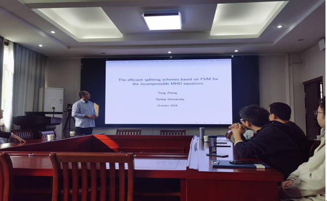 10月28日上午,应太阳集团城娱8722邀请,烟台大学张通教授作了题为《The efficient splitting schemes based on FVM for the incompressible MHD equations》的学术报告,部分老师及研究生聆听了此次报告。