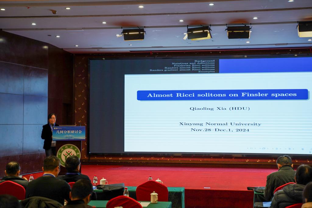 第2场报告是由杭州电子科技大学的夏巧玲教授作了题目为“Almost Ricci solitons on Finsler spaces”的学术报告,此场报告由武汉大学的陈群教授主持。