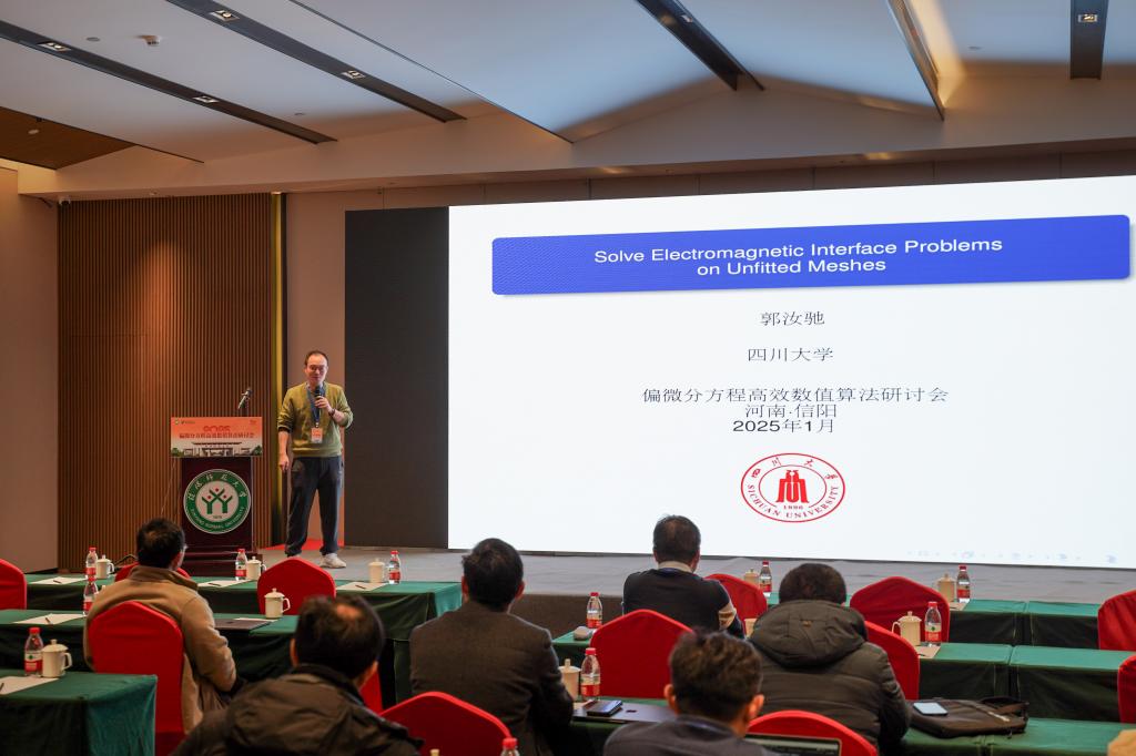 第1场报告由四川大学郭汝驰教授作了题目为《Solve electromagnetic interface problems on unfitted meshes》的学术报告。