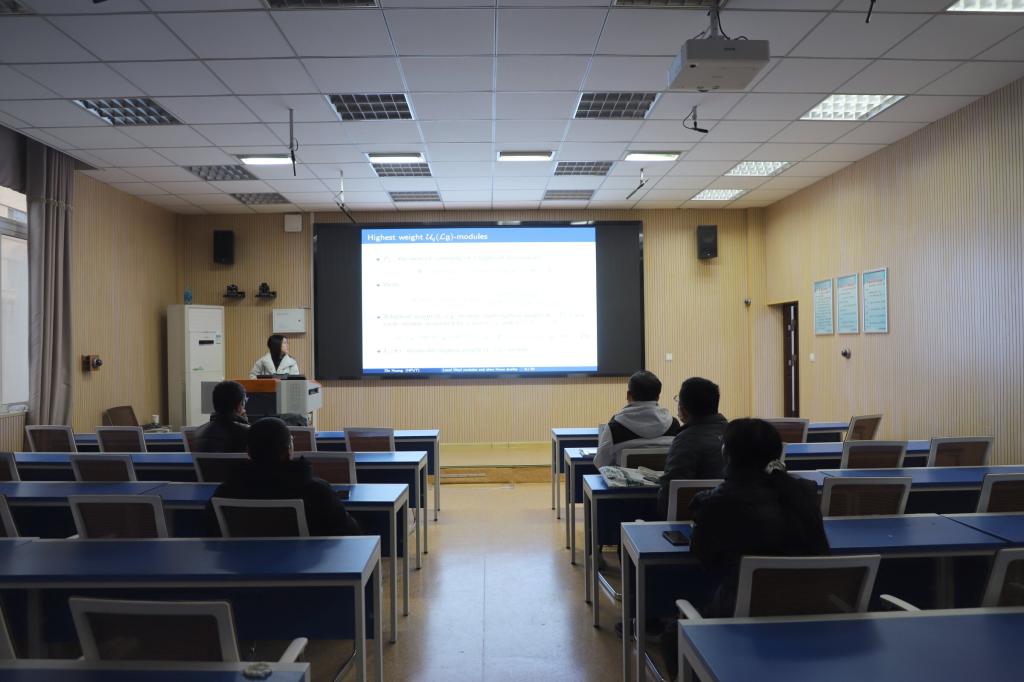 在报告中,黄鑫老师首先介绍了 Chari 和 Pressley 引入的量子仿射代数的 Weyl 模。仿射李代数的 Weyl 模即 量子仿射代数 Wely 模的经典极限。然后利用 Howe duality 的工具,具体给出了 A 型仿射李代数 Weyl 模的具体实现。会后重点和师生讨论了 Weyl 模的重要性及其他类型仿射李代数 Weyl 模实现的进展及李超代数的可行性问题。
