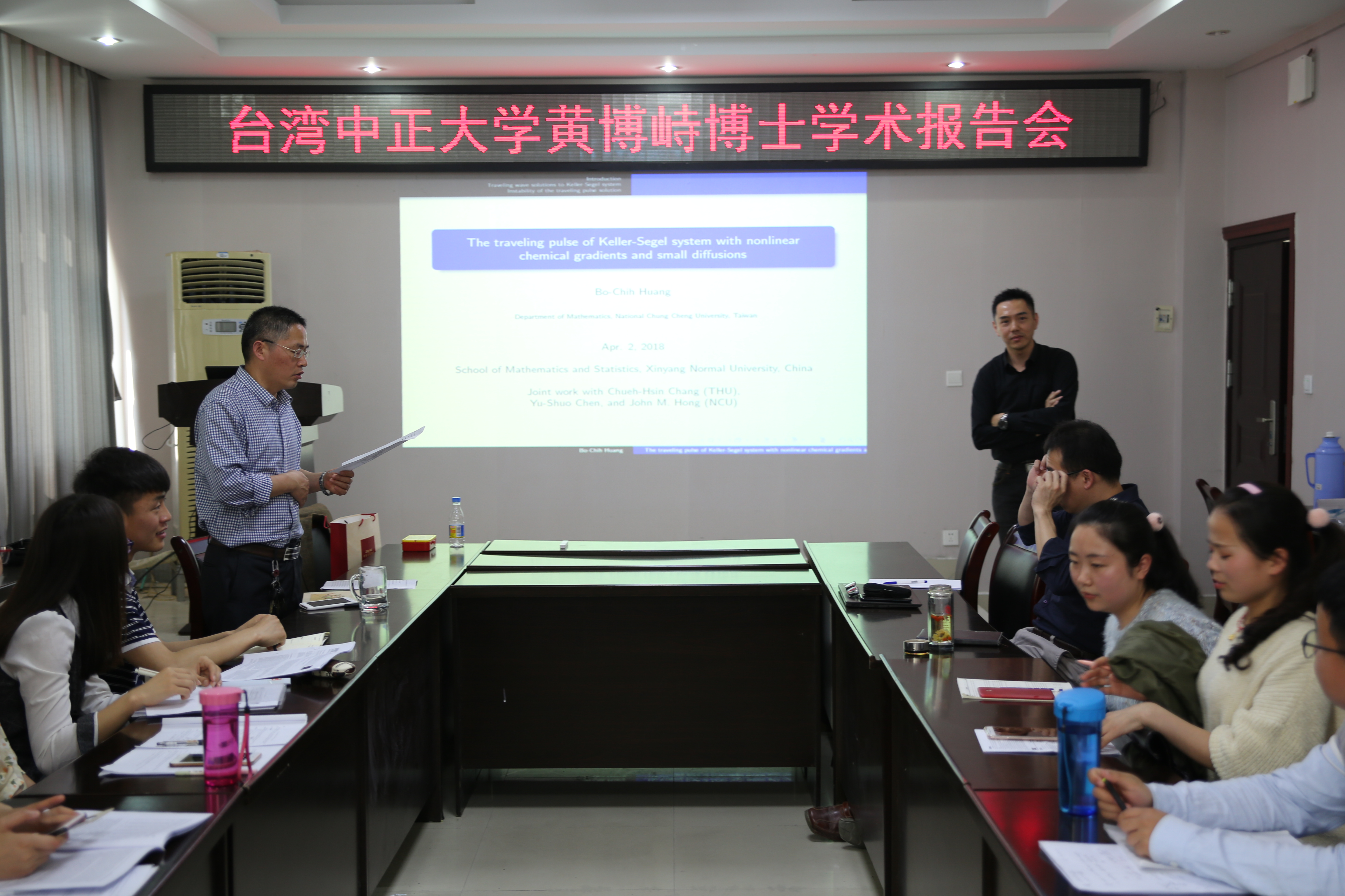 黄博峙(Bo-Chih Huang)博士首先就人体血管中细胞运动扩散的的复杂性阐述了Keller-Segel系统提出背景和研究进展,从而提出具有非线性化学扩散的Keller-Segel模型,其次报告了他与合作者运用通过几何奇异摄动理论和捕获区域证明了行波脉冲的存在性,并利用线性化算子的谱分析来考虑行波脉冲的线性不稳定性。最后,就近年来反应扩散方程建模研究关于细胞、气流扩散等前沿问题,与在座师生进行互动,会场气氛活跃。