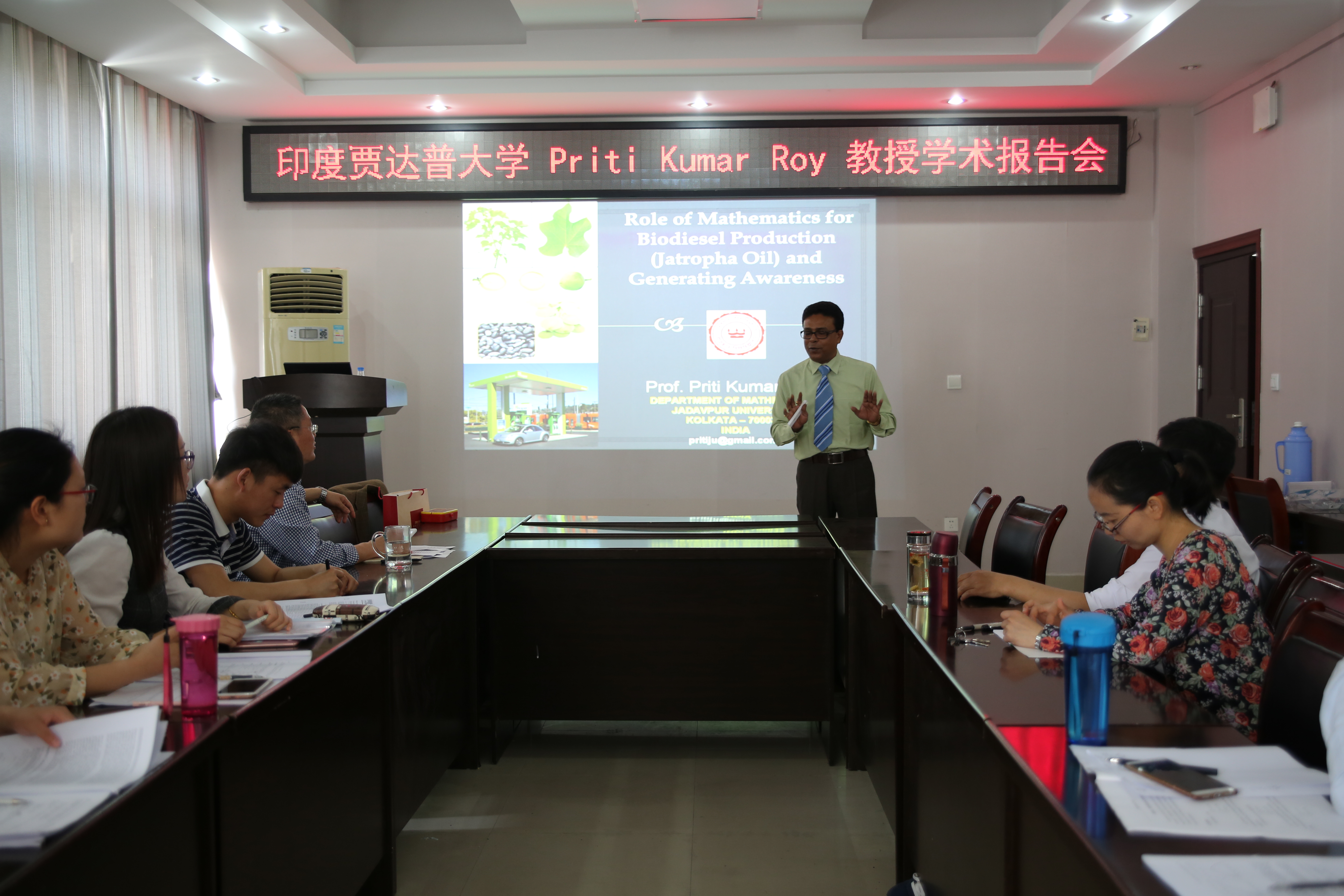 Priti Kumar Roy教授首先对当前矿物油行业对生态环境的危害进行了介绍,并就可再生的生物柴油在国际研究及生产现状和发展趋势做了说明,特别强调了广泛分布于热带和亚热带地区的麻风树开发生物柴油的潜在价值和广泛前景。其次Priti Kumar Roy教授讲述了麻风树的种植、生态管理以及麻风树种子转变为生物柴油的生成过程。最后Priti Kumar Roy教授分享了研究团队近年来依据麻风树对生态、社会和生产相互作用而提出系列数学模型,并运用控制和优化理论、方法来探讨如何通过生态保护和生产管理来优化生物柴油生产,获得生物柴油产值最大化。报告深入浅出,不断激起在座师的兴趣。近年来,Priti Kumar Roy教授先后3次来我校进行学术交流和访问。
