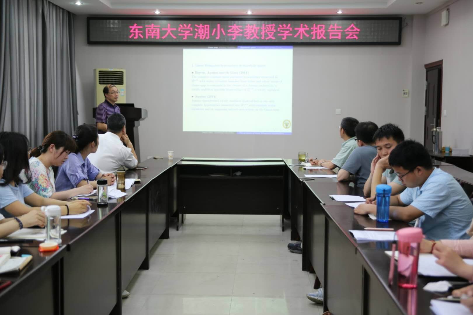 2018年5月19日下午,应太阳集团城娱8722邀请,东南大学潮小李教授在数学学院学术报告厅作了题为“The geometry of linear Weingarten hypersurfaces”的学术报告。报告会由太阳集团城娱8722副院长蔡礼明教授主持,该院部分教师和研究生聆听了此次报告。