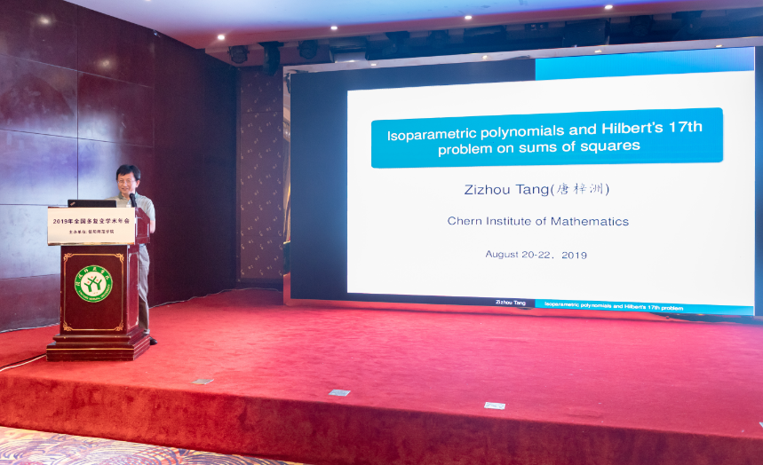 8月22日上午,会议特邀报告由首都师范大学吴可教授主持,南开大学唐梓洲教授作了题目为《等参多项式与Hilbert 问题》的报告。他指出一个实系数多项式,如果能写成一些多项式的平方和,那就一定是非负多项式。反过来,一个非负多项式是否一定可以写成多项式的平方和?这个问题, Hilbert 在1888年给出了解答,直到80多年后才有具体例子。E. Cartan 在研究球面中的等参超曲面的时候,将几何问题转化成了一个(等参)多项式问题。他对于这种非负多项式是否可以写成平方和,给出了完全的解答,并得到一些应用。
