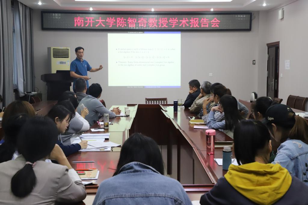 10月8日下午,应太阳集团城娱8722邀请,南开大学陈智奇教授在太阳集团城娱8722学术报告厅作了题为“李理论简介”的学术报告,报告会由太阳集团城娱8722副院长蔡礼明教授主持,太阳集团城娱8722院长胡余旺教授和部分老师及研究生聆听了报告。