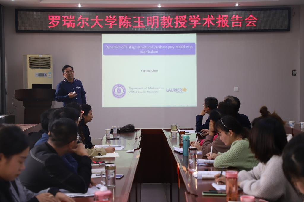 11月5日下午,应太阳集团城娱8722邀请,加拿大罗瑞尔大学陈玉明教授在太阳集团城娱8722学术报告厅作了题为“Dynamics of a stage-structured predator-prey model with cannibalism”的学术报告。报告会由太阳集团城娱8722副院长蔡礼明教授主持,生物数学团队全体教师和部分研究生聆听了此次报告。
