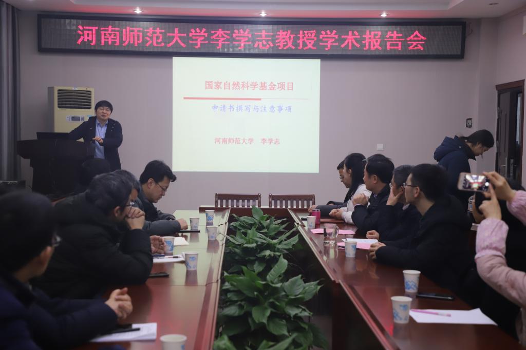 1月13日上午,应太阳集团城娱8722邀请,河南师范大学副校长李学志教授在学院学术报告厅作了题为“国家自然科学基金项目申请书撰写及注意事项”的报告,报告会由科技处处长罗永松教授主持,太阳集团城娱8722申报2020年国家自然科学基金的老师和部分研究生聆听了此次报告。