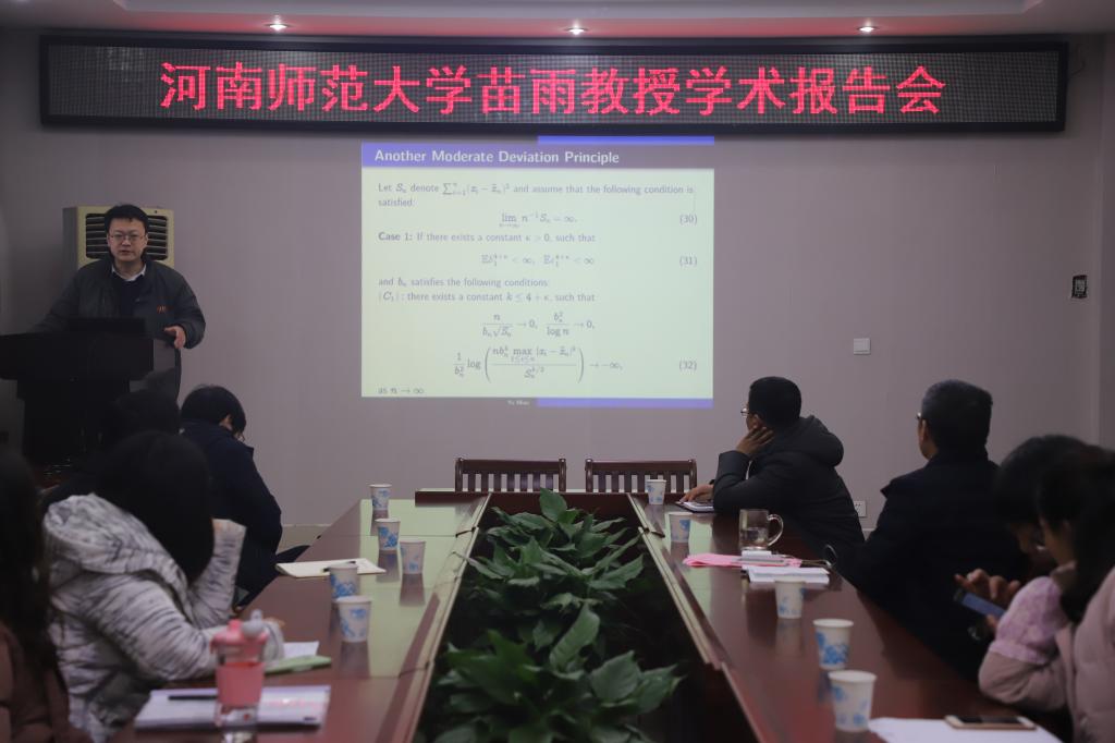 1月13日下午,应太阳集团城娱8722邀请,河南师范大学苗雨教授在学院学术报告厅作了题为“Some asymptotic properties LS estimators in EV model”的报告,报告会由太阳集团城娱8722副院长蔡礼明教授主持,太阳集团城娱8722党委书记王娟教授,数学研究所所长宋新宇教授,学院部分老师和研究生聆听了此次报告。