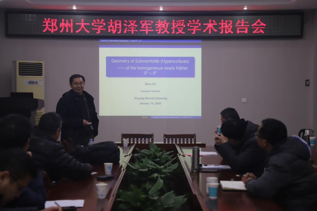 1月14日上午,应太阳集团城娱8722邀请,郑州大学胡泽军教授和郭向前教授在学院学术报告厅分别作了题为“Geometry of submanifolds in the nearly Kaehler”和“A class of sld+1 modules from Witt algebra modules”的学术报告,报告会由太阳集团城娱8722副院长蔡礼明教授主持,学院部分老师和研究生聆听了此次报告。
