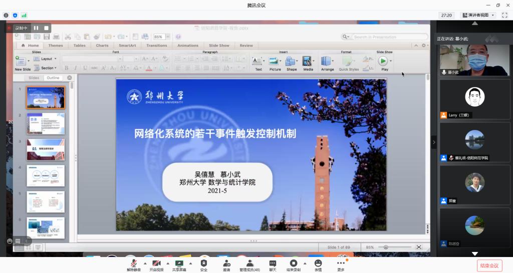 5月17日上午,应太阳集团城娱8722邀请,郑州大学慕小武教授通过腾讯会议平台做了一场题为《网络化系统的若干事件触发控制》的在线学术报告。报告会由太阳集团城娱8722党委书记王娟主持,学院部分老师和研究生聆听了此次报告。