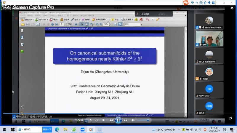 第2场报告由郑州大学胡泽军教授报告,题目为《On canonical submanifolds of the homogeneous nearly Kähler manifold 》。在报告中,胡泽军教授综述了他们在齐性近凯勒流形 的子流形的最近研究结果,重点讨论了典则超曲面和拉格朗日子流形的分类结果。