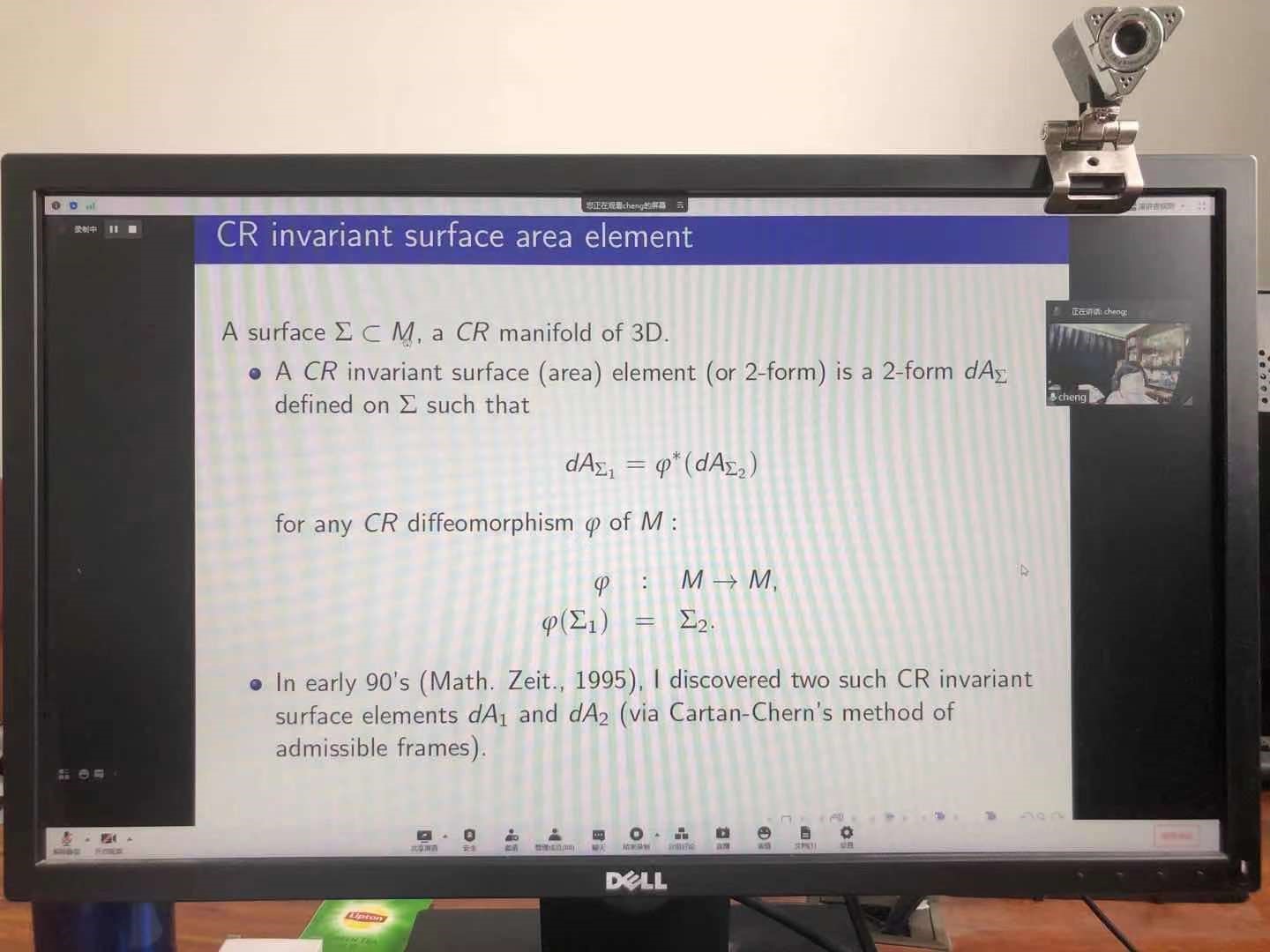 第2场报告由台湾中研院郑日新教授报告,题目为《CR invariant surfaces and hyperbolic equations》。在报告中,郑日新教授介绍了两个CR几何版本的Willmore能量泛函。他分析了其中一个Willmore能量泛函的极小值,并将其与双曲方程理论联系起来。