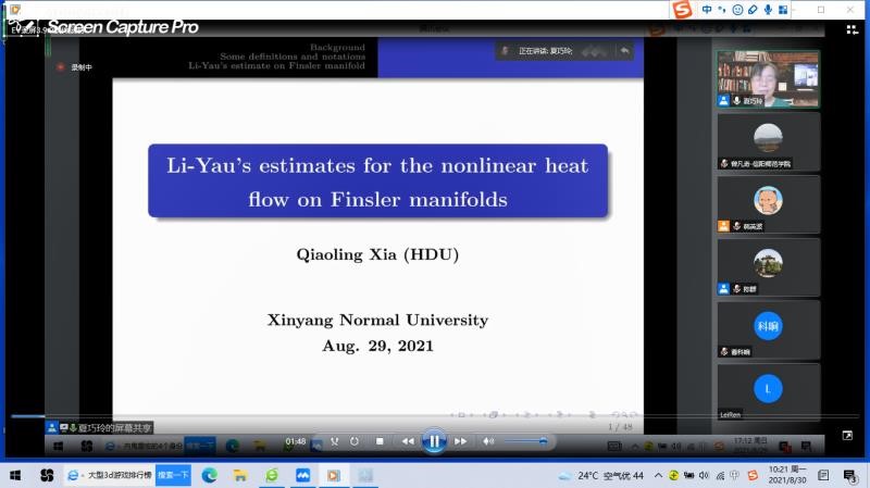 第3场报告由杭州电子科技大学夏巧玲教授报告,题目为《Li-Yau’s estimates for the nonlinear heat flow on Finsler manifolds》。在报告中,夏巧玲教授首先回顾 Finsler流形上的 非线性热流的一些进展。然后介绍具有加权 Ricci 曲率下界的紧致或完备非紧Finsler 流形上的非线性热流的正解的Li-Yau型估计及它们的应用。