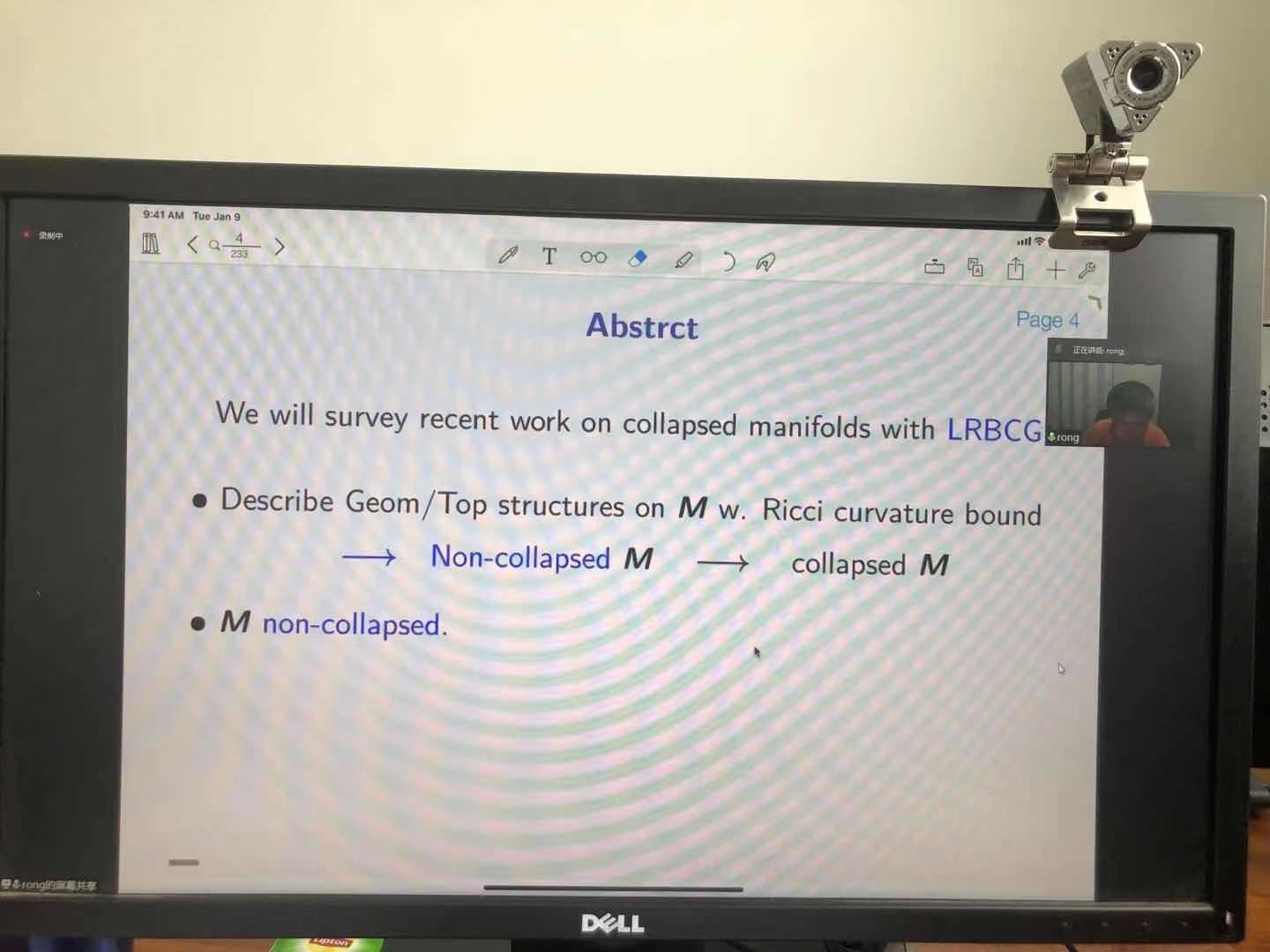 第1场报告由国际著名微分几何学专家、美国Rutgers大学戎小春教授报告,题目为《Collapsed Manifolds with Local Ricci Bounded Covering Geometry》。在报告中,戎小春教授讨论了Gromov的塌缩流形理论的一些最近的推广,例如在具有局部有界Ricci曲率覆盖几何的最大塌陷流形上。Gromov的塌缩流形理论是Gromov在1978年发现的,已成为具有有界截面曲率的塌缩流形理论的基石。