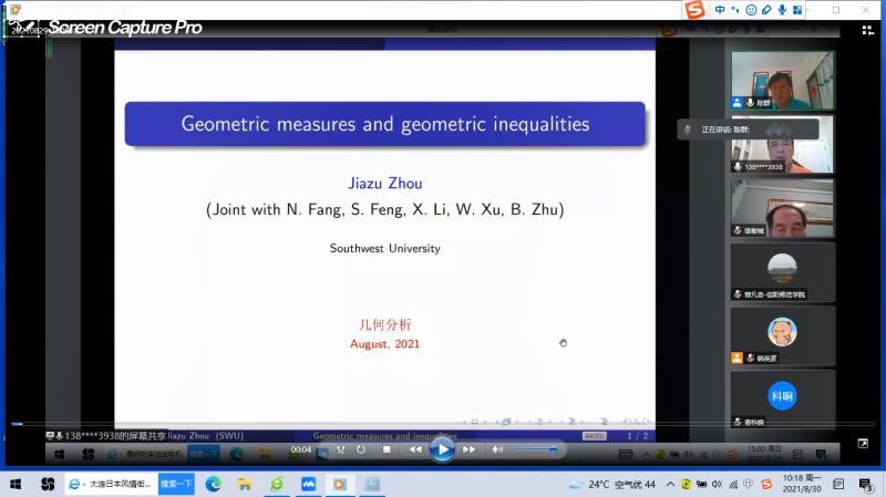 第1场报告由西南大学数学院教授、博士导师、数学研究所所长周家足教授报告,题目为《Geometric measures and geometric inequalities》。在报告中,周家足教授首先介绍几何对象的几何测度。然后讨论了积分几何中的几何测度和Quermass积分和微分几何中的平均曲率积分之间的联系。