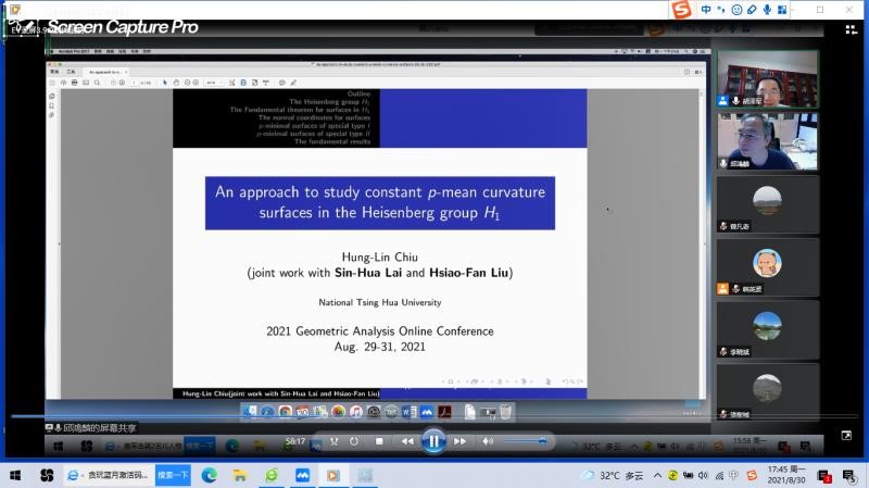 第2场报告由台湾清华大学邱鸿麟教授报告,题目为《An approach to study constant p-mean curvature surfaces in the Heisenberg group 》。在报告中,邱鸿麟教授介绍了一种研究常p-平均曲率曲面的方法。邱鸿麟教授将常 p-平均曲率曲面的研究转化为研究二阶常微分方程。最终获得了常p-平均曲率曲面的一组完备的不变量。