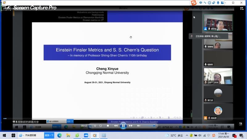 第1场报告由重庆师范大学程新跃教授报告,题目为《Einstein Finsler Metrics and S. S. Chern’s Question》。在报告中,程新跃教授首先在黎曼流形上使用 Killing 形式来构造一类 Finsler 度量,以此找到了刻画爱因斯坦度量的方程。特别地,程新跃教授在上构造了一系列爱因斯坦度量,这一族爱因斯坦度量提供了3维流形上一类重要的具有常Ricci曲率但旗曲率不是常数的 Finsler 度量。