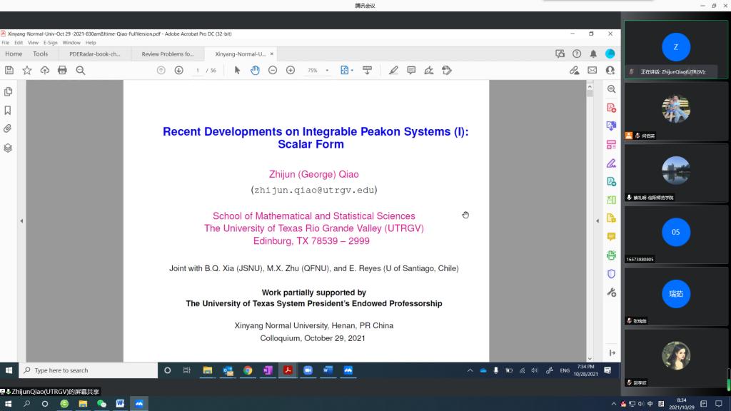 10月29日上午,应太阳集团城娱8722邀请,美国德克萨斯大学乔志军教授通过腾讯会议平台为我院研究生及相关研究方向老师作了题为《Recent Developments on Integrable Peakon Systems》的学术报告。报告会由太阳集团城娱8722院长蔡礼明教授主持。