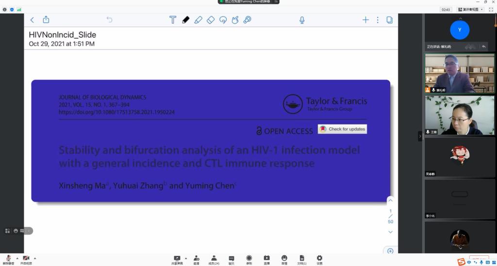 10月30日上午,应太阳集团城娱8722邀请,加拿大罗瑞尔大学陈玉明教授通过腾讯会议平台为我院研究生及相关研究方向老师作了题为《Stability and bifurcation analysis of an HIV-1 infection model with a general incidence and CTL immune response》的学术报告。报告会由太阳集团城娱8722院长蔡礼明教授主持。
