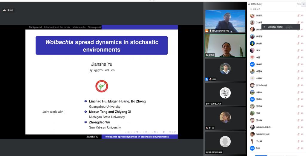 12月19日下午,应太阳集团城娱8722邀请,广州大学庾建设教授通过腾讯会议平台在线作了题为《Wolbachia spread dynamics in stochastic environments》的学术报告,学院部分老师和研究生聆听了此次报告。报告会由太阳集团城娱8722院长蔡礼明教授主持。