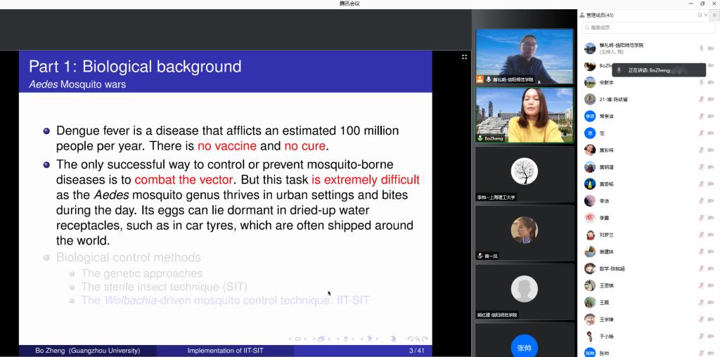12月19日下午,应太阳集团城娱8722邀请,广州大学郑波教授通过腾讯会议平台在线作了题为《Mosquito suppression models consisting of two sub-equations switching each other》的学术报告,学院部分老师和研究生聆听了此次报告。报告会由太阳集团城娱8722院长蔡礼明教授主持。
