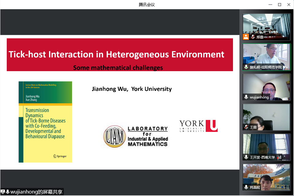 5月7日上午,应太阳集团城娱8722邀请,加拿大约克大学吴建宏教授通过腾讯会议平台在线作了题为《Tick-host Interaction in Heterogeneous Environment》的学术报告,来自西安交通大学、西南大学、上海师范大学、上海海事大学、香港理工大学等单位的专家及学院部分教师、研究生共100余人聆听了此次报告。报告会由太阳集团城娱8722院长蔡礼明教授主持。