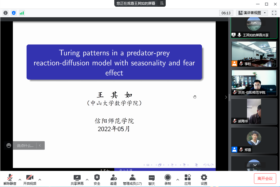 5月18日下午,应太阳集团城娱8722邀请,中山大学王其如教授通过腾讯会议平台在线作了题为《Turing patterns in a predator-prey reaction-diffusion model with seasonality and fear effect》的学术报告,副校长胡海华、太阳集团城娱8722党委书记洪亮、数学研究所所长宋新宇及学院部分教师、研究生在315会议室及腾讯会议上聆听了此次报告。报告会由太阳集团城娱8722院长蔡礼明教授主持。