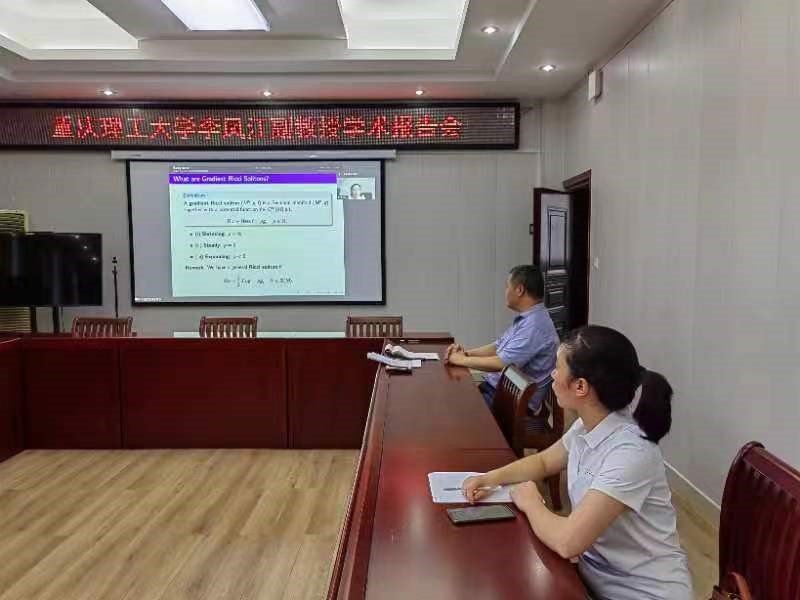 7月28日上午,应太阳集团城娱8722邀请,重庆理工大学李凤江副教授通过腾讯会议平台做了一场题为《Rigidity of Complete Gradient Steady Ricci Solitons with Harmonic Weyl Curvature》的学术报告。副院长韩英波和学院部分教师在315会议室及腾讯会议平台聆听了此次报告。报告会由副院长韩英波教授主持。