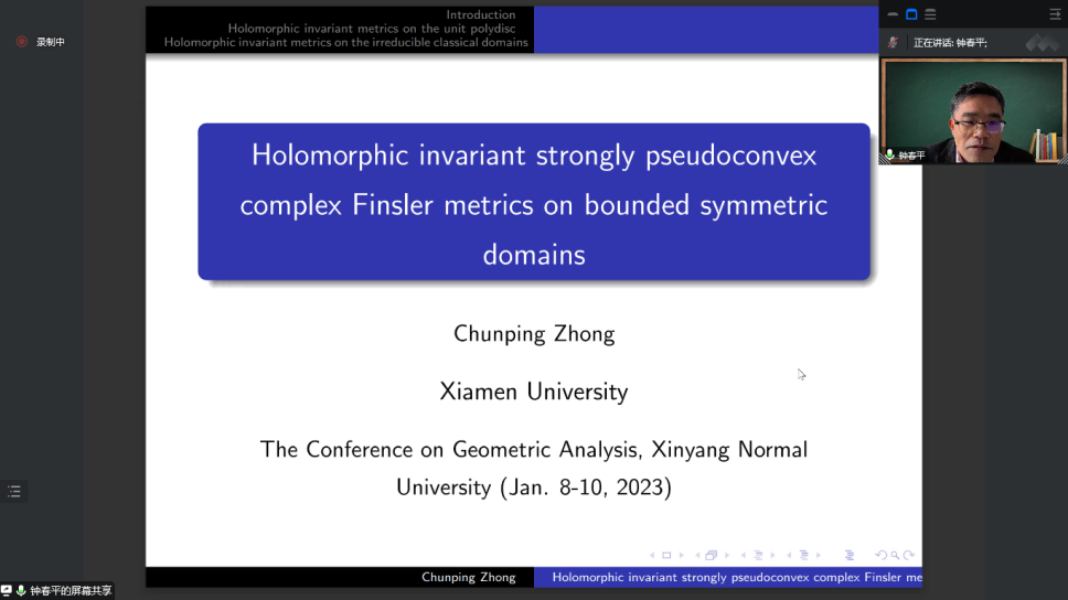 第3场报告由厦门大学钟春平教授报告,题目为《Holomorphic invariant strongly pseudoconvex complex Finsler metrics on bounded symmetric domains》。在报告中,钟春平教授给出 $\mbox{Aut}(P_n)$-不变强伪凸复Finsler度量的一个刻画。钟春平教授还给出全纯不变强伪凸复Finsler度量的一个精细构造。