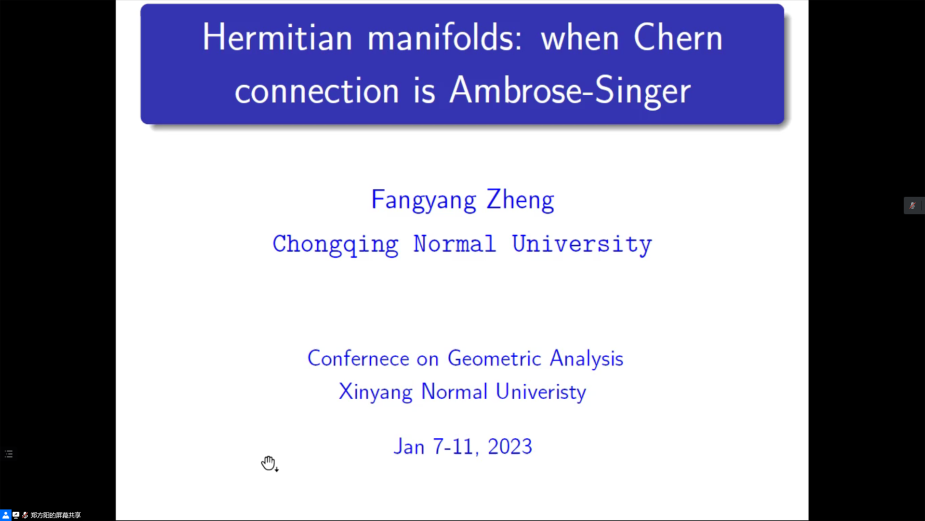 第1场报告由重庆师范大学郑方阳教授报告,题目为《Hermitian manifolds: when Chern connection is Ambrose-Singer》。在报告中,郑方阳教授讨论了一种特殊类型的局部齐次Hermitian流形:其Chern联络为Ambrose Singer,即具有平行挠率和平行曲率。郑方阳教授证明这种流形的万有覆盖空间是总是Hermitian对称空间和复李群的乘积。