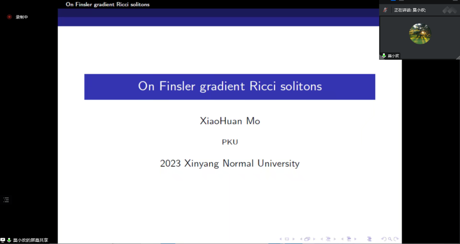 第2场报告由北京大学莫小欢教授报告,题目为《On Finsler gradient Ricci solitons》。在报告中,莫小欢教授讨论了Ricci曲率满足Finsler gradient Ricci solitons的一类Finsler测度空间,并且给出了一些例子。
