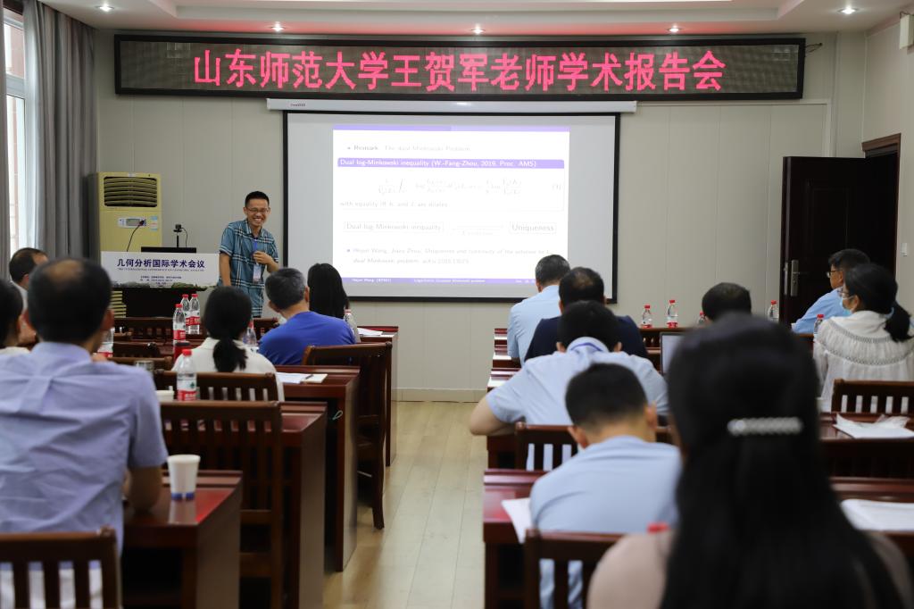 第3场报告由山东师范大学王贺军博士报告,题目为《logarithmic Guassian Minkowski problem》。在报告中,王贺军博士讨论了对数 Gaussian Minkowski 问题的解的存在唯一性。