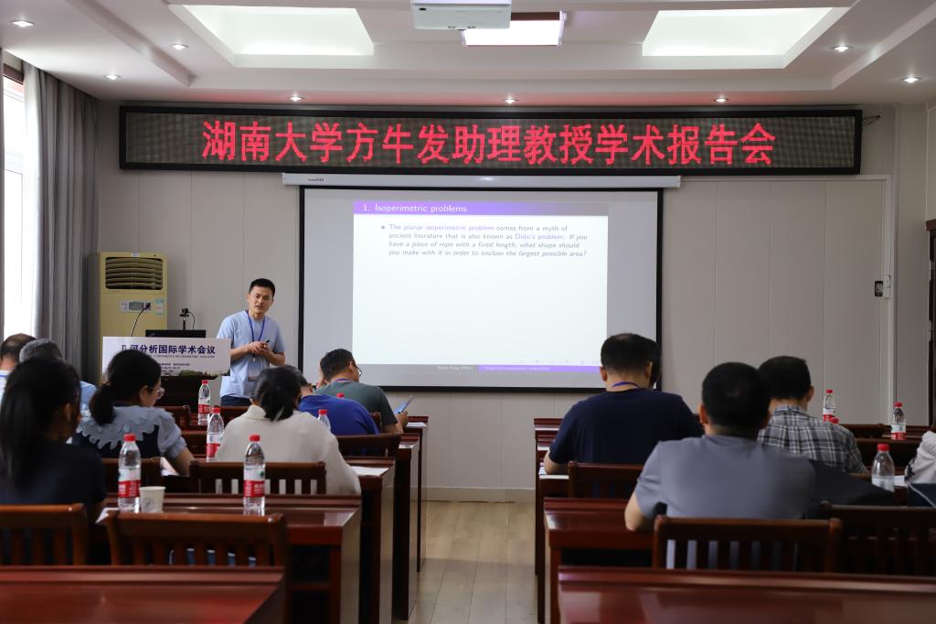 第3场报告由湖南大学方牛发助理教授报告,题目为《The weighted isoperimetric inequalities》。在报告中,方牛发助理教授首先综述了加权等周不等式的最近研究结果。重点讨论了关于加权质心体的加权等周不等式。