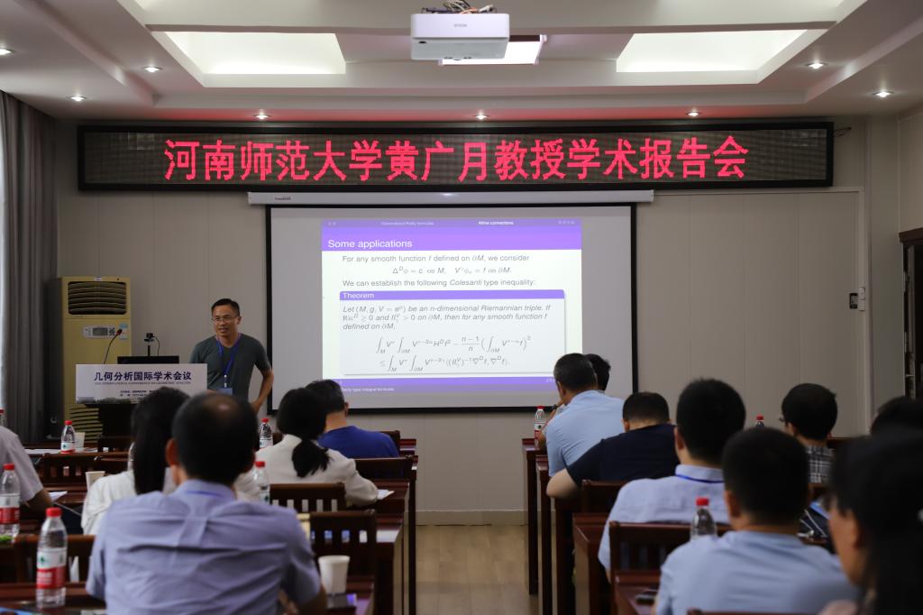 第2场报告由河南师范大学黄广月教授报告,题目为《Reilly type integral formulas and some related applications》。在报告中,黄广月教授综述了Reilly 型积分公式的最近研究结果,重点讨论了光滑度量测度空间和具有仿射联络的黎曼流形上的Reilly 型积分公式。最后给出在几何不等式和特征值上的应用。