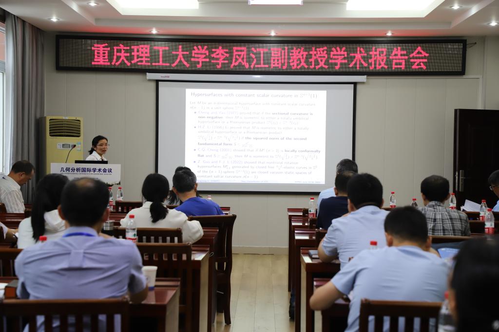 第4场报告由重庆理工大学李凤江副教授报告,题目为《New characteristic of vacuum static spaces on rotational hypersurfaces》。在报告中,李凤江副教授给出常曲率空间的旋转超曲面上的真空静态空间的一些新的刻画。