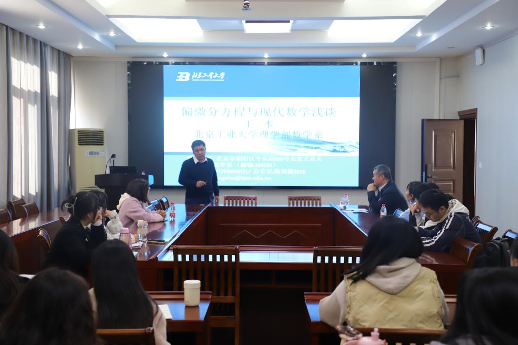 11月17日下午,应太阳集团城娱8722邀请,北京工业大学王术教授在太阳集团城娱8722315会议室做了一场题为《偏微分方程与现代数学浅谈》的学术报告。报告由太阳集团城娱8722副院长韩英波教授主持,部分老师、研究生和本科生聆听了此次报告。