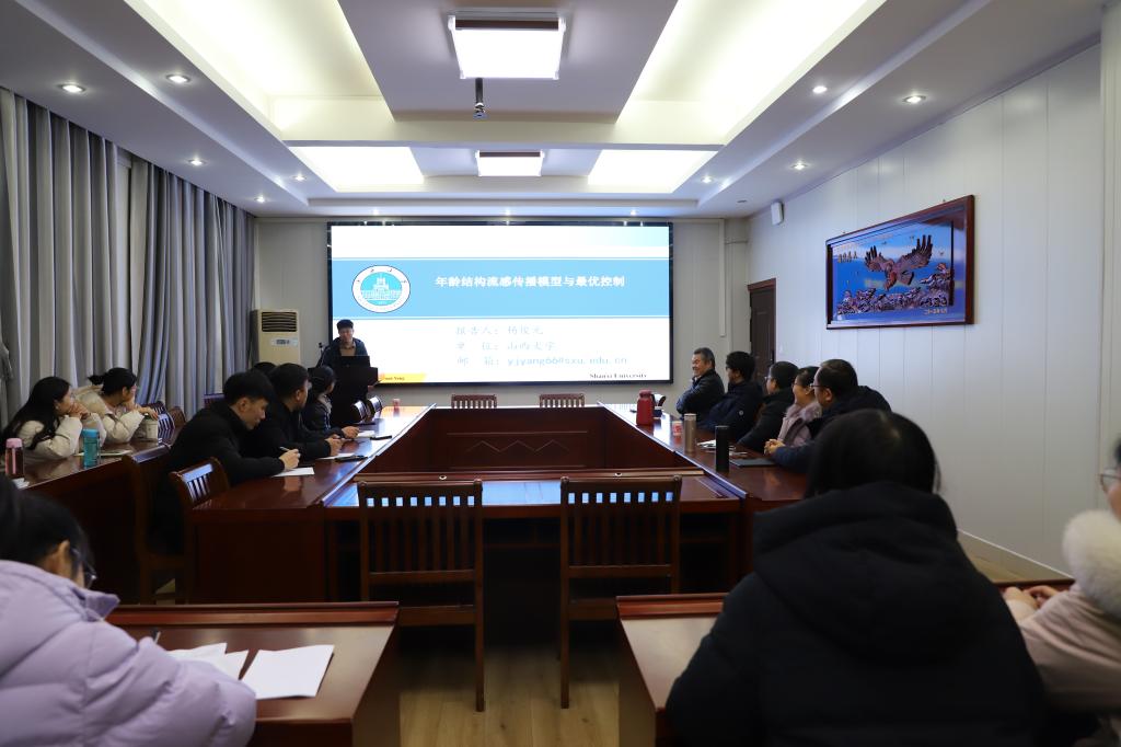 12月15日,应太阳集团城娱8722邀请,山西大学杨俊元教授在数学楼315会议室做了题为 “Optimal strategies of the age-specific vaccination and antiviral treatment against influenza” 的学术报告。院长蔡礼明教授、副院长韩英波教授参加了报告会。报告会由太阳集团城娱8722王霞教授主持,部分教师和研究生聆听此次报告会。
