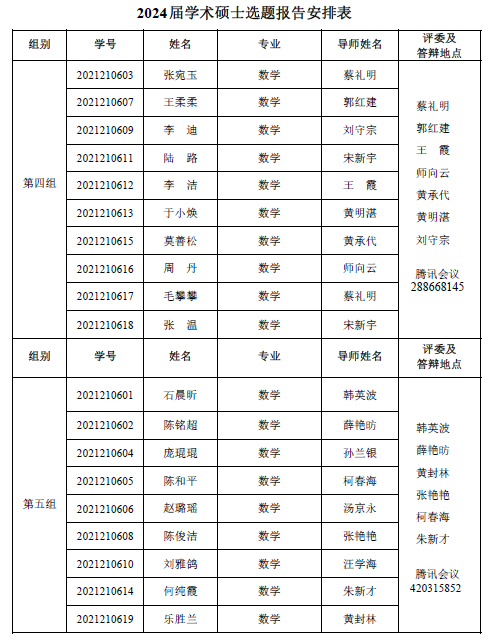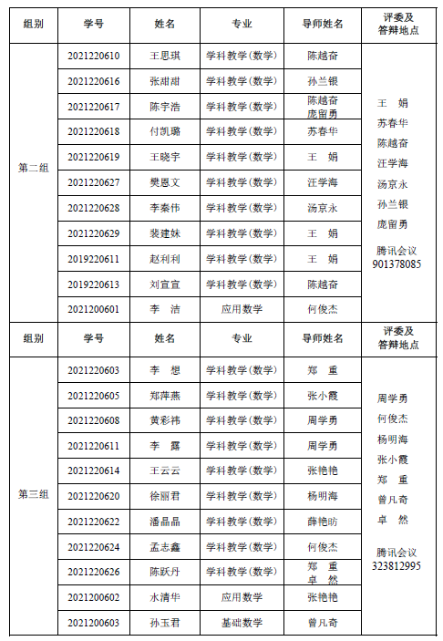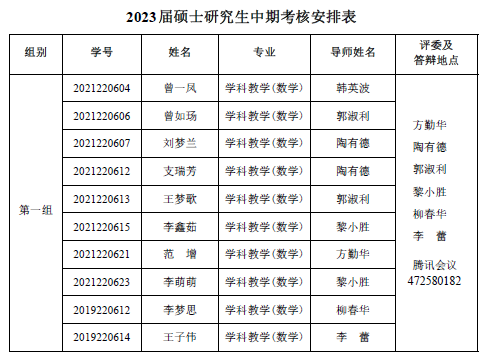 太阳集团城娱8722 2022-2023 学年第一学期 2021级专业硕士研究 生(两年制专业硕士)、2021 级同等学力研究生、2019 级硕师计划研 究生学位论文中期考核和 2021 级学术硕士研究生(三年制学术硕士)学位论文选题报告答辩会定于 2023 1 6日14:30—18:00在腾讯会议平台举行,具体分组见下表。参加答辩的同学需提前填信阳师范学硕士研究生学位文选题报》或信阳师范学硕士研究生中期核表》,按照选报告或中期考核所列内容准备 12 分钟左右的汇报课件参加答辩,届时不参加答辩的同学视为考核不通过。