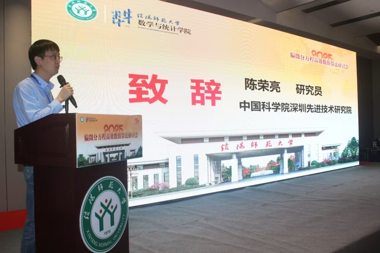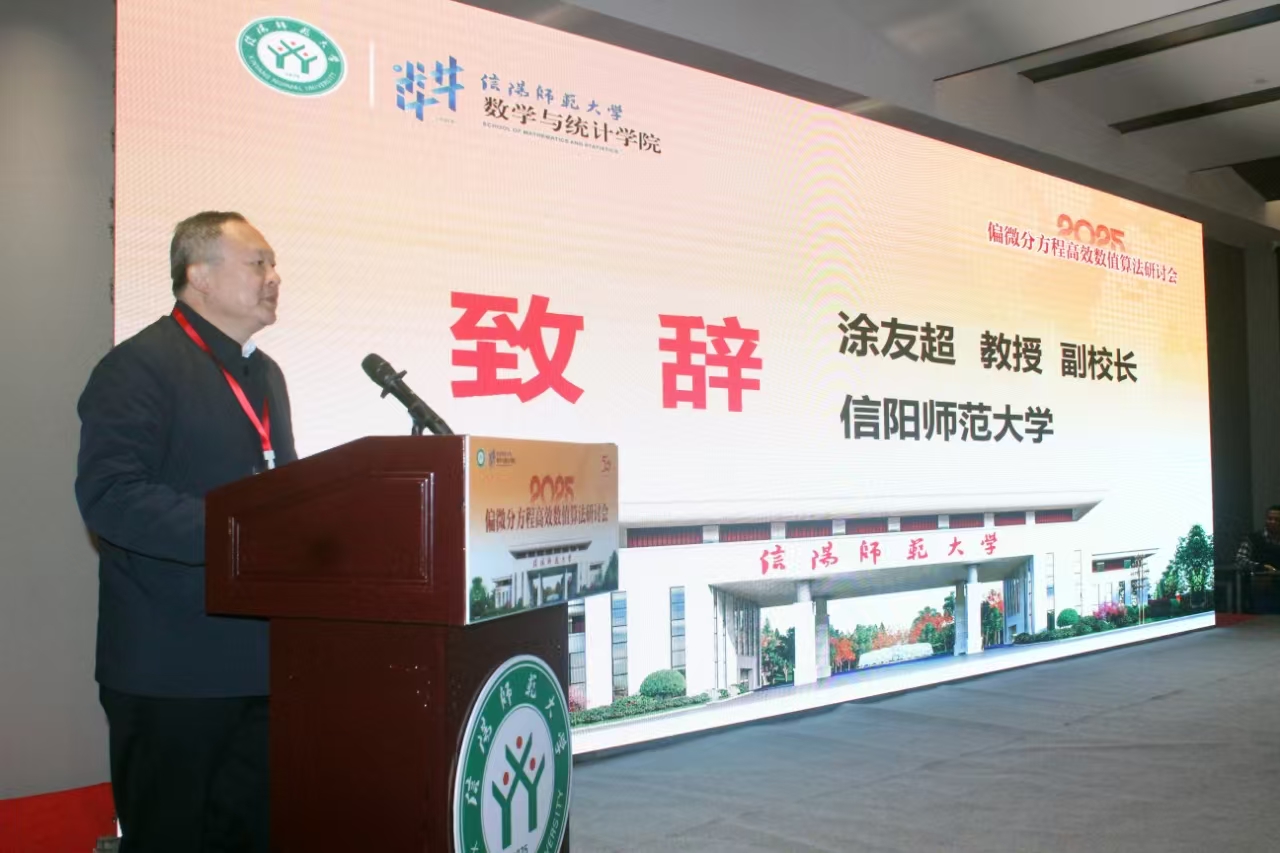 涂友超代表学校致欢迎辞,向出席会议的专家学者表示热烈欢迎,向支持我校发展的专家学者表示衷心感谢,简单介绍了学校的基本情况和近年来建设高水平师范大学方面所取得的成就。重点介绍了我校计算数学团队近年来取得的成绩和未来发展规划。涂友超强调数学学科作为信阳师范大学优势学科,一直受到学校的高度重视与重点支持。当前学校数学学科正处于申报博士点、实现跨越式发展的关键时刻,希望与会专家学者对我校数学学科建设提出宝贵意见和建议,加强交流与合作,推动我校数学学科快速发展,助力博士点培育建设。预祝本次研讨会取得圆满成功,期待通过此次盛会,携手共创数学研究的新篇章。学术委员会成员陈荣亮研究员致辞,对偏微分方程高效数值算法研讨会的召开表示热烈祝贺,对信阳师范大学太阳集团城娱8722高度重视、精心组织和辛勤工作表示感谢,对各位专家的大力支持表示感谢。对我校近年来取得的办学成就和太阳集团城娱8722计算数学团队取得的科研成果给予了高度评价。