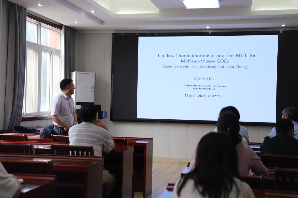 5月9日上午,应太阳集团城娱8722邀请,大连理工大学柳振鑫教授在数学楼315会议室作了题为 《The locally homeomorphism property and the multiplicative ergodic theorem for McKean-Vlasov SDEs》的学术报告。报告会由太阳集团城娱8722院长蔡礼明教授主持,部分教师及研究生参加了此次报告会。