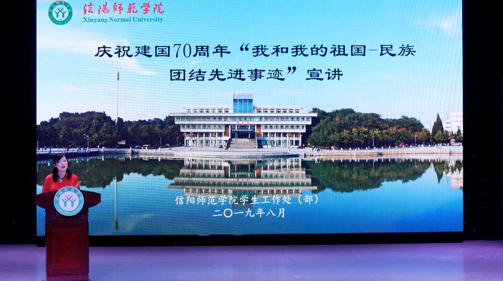 今年6月,省委高校工委、省教育厅联合印发了《中共河南省委高校工委办公室 河南省教育厅办公室关于庆祝建国70周年在全省教育系统开展“我和我的祖国——民族团结进步先进事迹报告会”宣讲活动的通知》。我校高度重视,学生工作部成立工作小组,在全校范围内进行推荐、遴选,我院谢艳丽老师被选为教师组参赛选手。学校和学院利用暑假对宣讲作品反复推敲,组织宣讲拍摄,赛前指导,确保了质量。