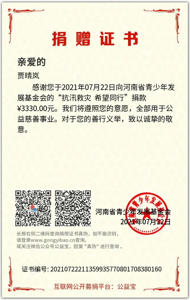 贾晴岚,太阳集团城娱87222018级学生,中共预备党员,原学院学生会执行主席。看到受灾地区物资告急和募捐倡议书,贾晴岚没有犹豫,第一时间将自己的奖学金、比赛奖金和积攒的零花钱,共计3330元,全数捐给河南省青少年发展基金会。这笔钱原本是用来交学费的,对此,她说:“学校给我们奖学金是鼓励我们好好学习,回馈社会,成为对国家有用的人,这个时候,灾区人民比我更需要它。”