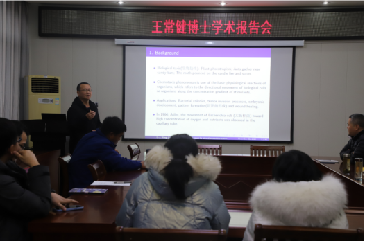 王常健博士作为第十三期论坛活动的主讲人,作了题为“A blow-up result for attraction-repulsion system with nonlinear signal production and generalized logistic source ”的学术报告。王博士介绍了一些常见的生物趋化现象以及趋化在现实生活中的重要应用。此外,王博士结合一类吸引-排斥趋化系统径向解的有限时间爆破问题向师生们汇报了近期的研究进展。报告结束后,王博士针对师生们提出的问题给出了详细的解答,并与师生就报告内容进行了热烈的讨论。